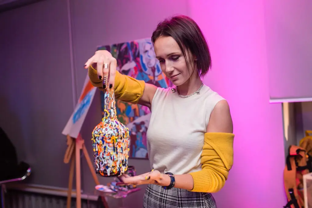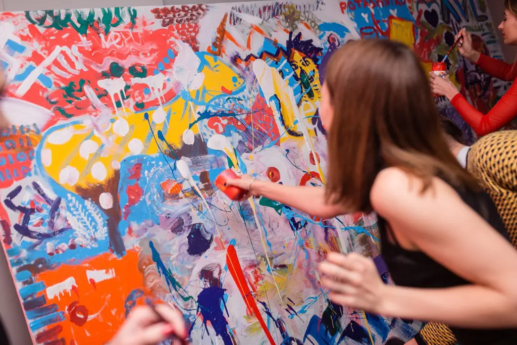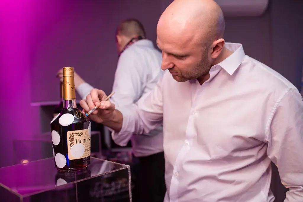 Сами гости могли не сдерживать свои творческие порывы и попытаться создать искусство из ярких красок прямо на мольбертах ,расставленных по всему залу. Все началось с открытия персональной выставки Олега Костюченко, которая наполнила пространство ироничным флером и задала тон всему вечеру. Потом были вспышки фотоаппаратов, приятные small talks, музыкальный бэнд. В какой-то момент взгляд остановился на ярко разукрашенных белых рубашках: как оказалось, гости решили не ограничиваться мольбертами, а перенести творчество на собственные рубашки. Художники творили экспромт над двумя бутылками, которые затем разыграли на аукционе. Все легко. Возможно, дело было в янтарном Hennessy или в отпустившей меня (как жаль, что только на один вечер) мигрени, но настроение и позитив от каждого мгновения просто зашкаливал. Я веселилась, и это было так прекрасно. Спасибо всем причастным к этим эмоциям — это был душевный вечер.