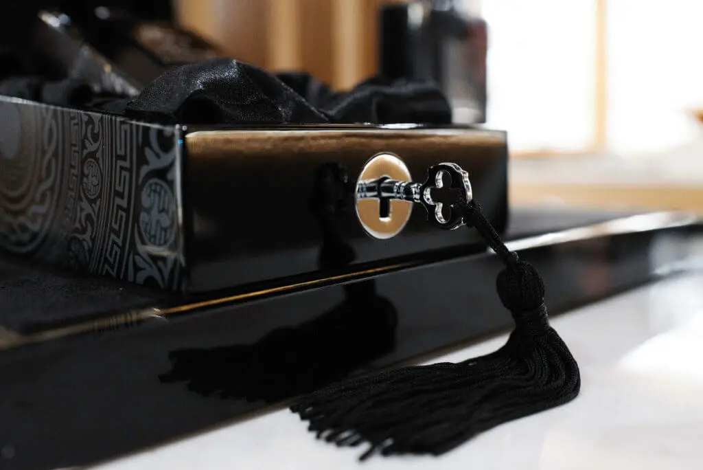 Парфюм помещен в лакированный деревянный футляр с ключом. Крышка футляра декорирована выпуклым элементом в виде улыбающегося черепа, он похож на мрачный и величественный монумент. Внутри шелковая подушка, на которой потом можно изящно хранить бриллианты. А можно футляр использовать как клатч, он этого достоин.