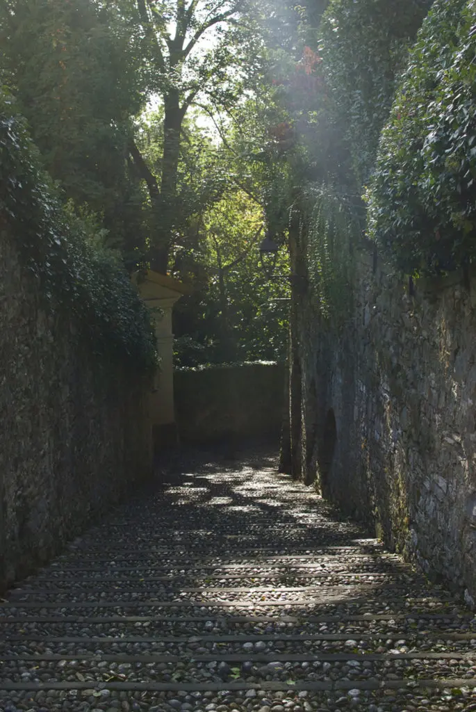Как и во всех рекомендациях «Бергамо за сутки«, я бы предложила начать прогулку с подъема в La Citta Alta на старом фуникулере. Стоит такое развлечение совсем не дорого — всего 1,20 евро, а удовольствия море. Движение начинается с туннеля, а затем маленький вагончик попадает в зеленый коридор и только к концу подъема открывается потрясающей красоты вид на «новый» город.