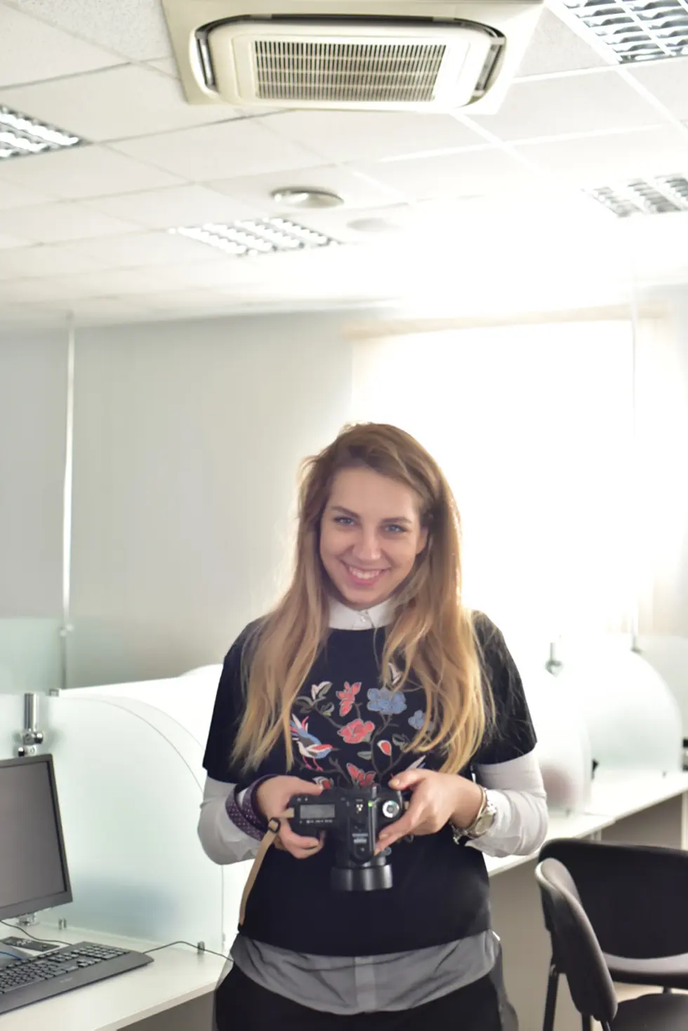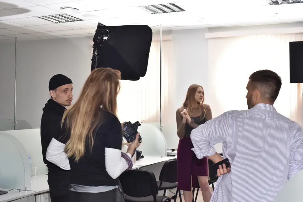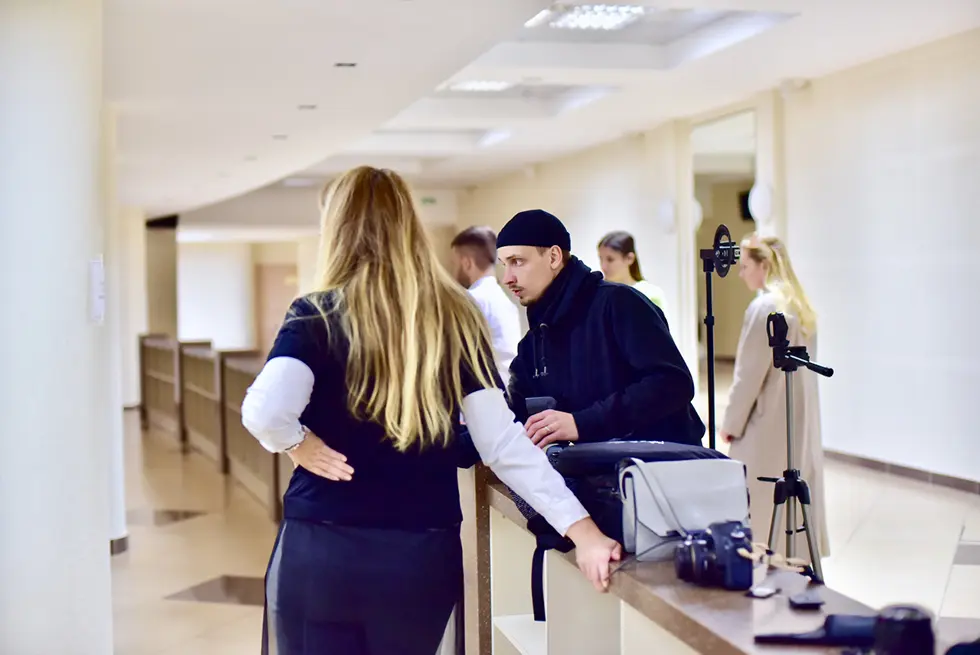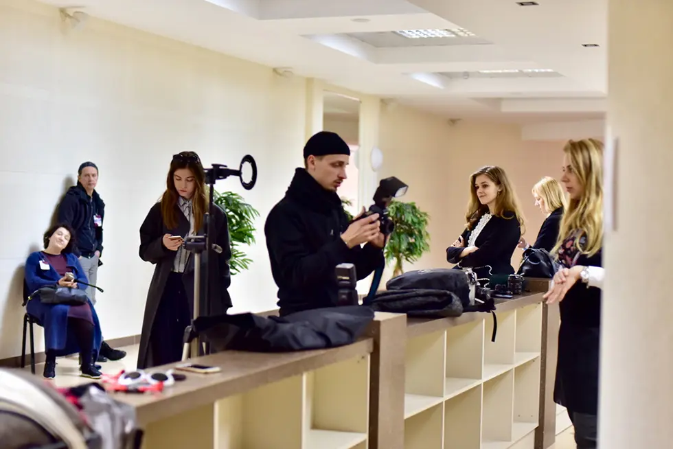 Выбор платья TON-IN-TON для первого образа и объяснение фотографам, каких кадров хочется. В дело идет всё: зеркала, пластиковая пальма и сам антураж нашего БелЭкспо, который мы все дружно не любим, потому что для нас он отдает нафталином. А вот иностранному гостю очень нравится.